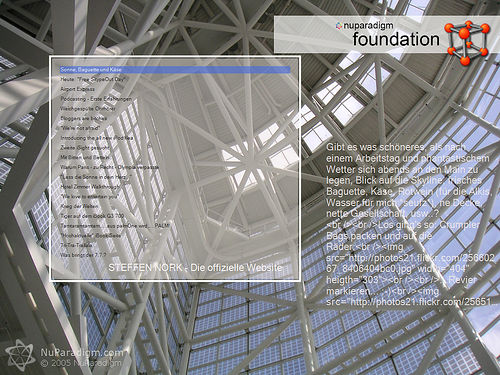 P.P.S.: wenn man jetzt die Seite mit dem IE betrachtet, sieht's natürlich "schepps" aus, d.h. es wird oben und nicht transparent angezeigt. Warum? Weil der IE keine transparenten png's und kein position: fixed (sondern nur absolute) unterstützt. *Buuuuh*