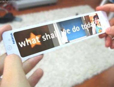 Ein sehr interessantes Ergebnis eines von Nokia ausgerufenen Design-Wettbewerbes ist der Prototyp eines Nokia 888-Modells. Quasi ein Streifen Technik, der auf der einen Seite aus reinem, biegsamen Display besteht. Ähnlich wie diese Reflektor-Armbänder, die man bei Hochschul-Referendaren auf Fahrrädern sieht.
