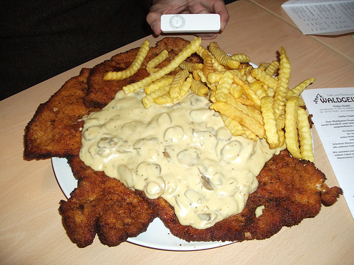 Stefan war so mutig und hat aus Neugier mal das "große" (Jäger-) Schnitzel bestellt. Geschafft hatte er es natürlich nicht, selbst ich habe von meinem "halben" nur 3/4 geschafft (und das will schon was heißen).