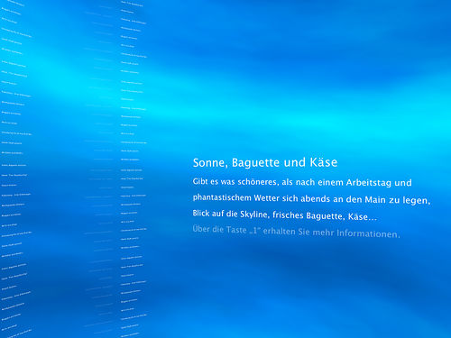 P.P.S.: wenn man jetzt die Seite mit dem IE betrachtet, sieht's natürlich "schepps" aus, d.h. es wird oben und nicht transparent angezeigt. Warum? Weil der IE keine transparenten png's und kein position: fixed (sondern nur absolute) unterstützt. *Buuuuh*