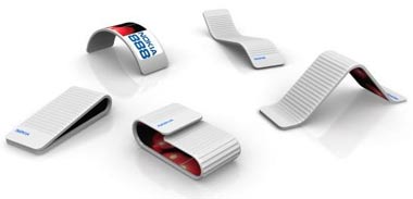 Ein sehr interessantes Ergebnis eines von Nokia ausgerufenen Design-Wettbewerbes ist der Prototyp eines Nokia 888-Modells. Quasi ein Streifen Technik, der auf der einen Seite aus reinem, biegsamen Display besteht. Ähnlich wie diese Reflektor-Armbänder, die man bei Hochschul-Referendaren auf Fahrrädern sieht.