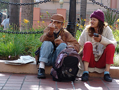 See zwei Frauen, die sich da ebenfalls die Mittagspause vertreiben - und die eine hat doch tatsächlich einen PocketPC mit integriertem GPS bzw. aufgestellter GPS-Antenne in der Hand!